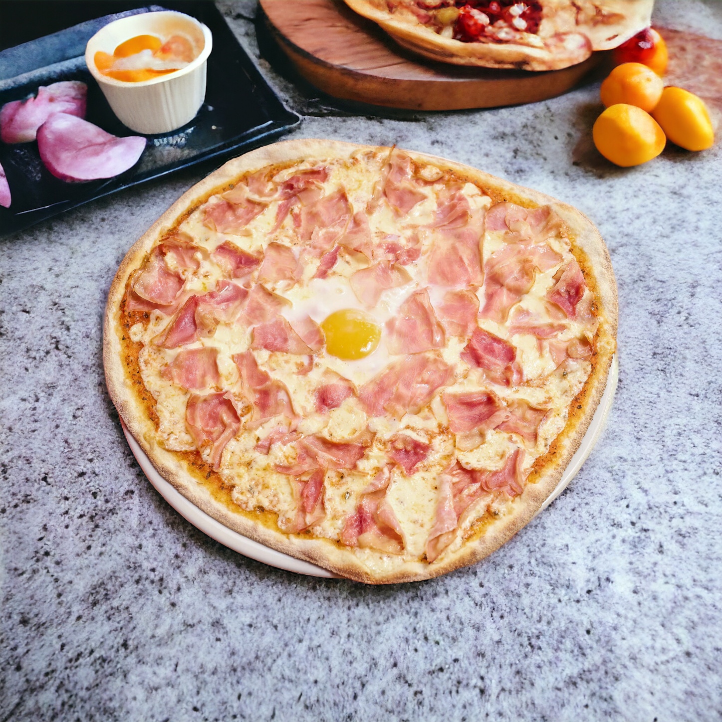 Tomate, mozzarella, bacon y huevo